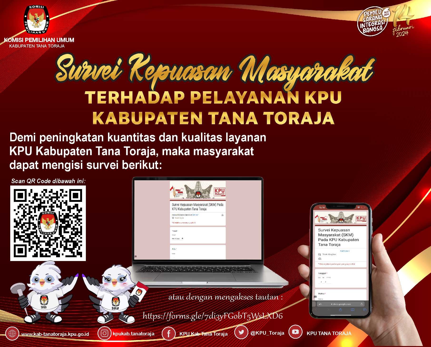 #TemanPemilih, Dengan berpedoman pada UU No. 25 tahun 2009, PP No. 96 Tahun 2012, Peraturan Menteri PANRB No. 14 Tahun 2017 tentang Pedoman Penyusunan Survei Kepuasan Masyarakat (SKM) Unit Penyelenggara Pelayanan Publik dan untuk untuk mengukur Indeks Kepuasan Masyarakat (IKM) pada pelayanan Komisi Pemilihan Umum Kabupaten Tana Toraja sebagai salah satu penyedia layanan publik di Kabupaten Tana Toraja, Kami mengajak Bpk/Ibu/Sdr(i) untuk memberikan penilaian melalui survei ini dengan waktu pengisian paling lambat tanggal 31 Agustus 2025. Kurre Sumanga'. Selengkapnya, simak di info grafis. #KPUMelayani ....