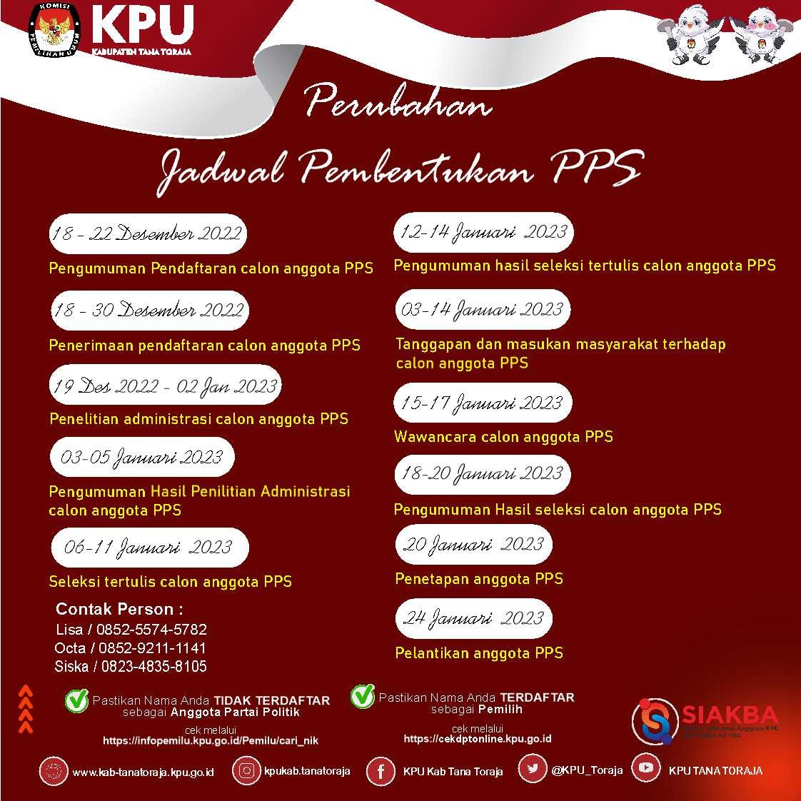 Pendaftaran Panitia Pemungutan Suara (PPS) Akan Berakhir pada tanggal 30 Desember 2022 Bagi Pendaftar Calon PPS diharapkan untuk selalu memeriksa progres pendaftaran pada akun SIAKBA dan Email untuk memastikan semua berkas "DITERIMA atau DIPERBAIKI" Apabila status pendaftaran telah berubah menjadi mencetak Form Tanda Bukti Pendaftaran pada Menu Aksi, selanjutnya akan diserahkan bersama dengan BERKAS FISIK kepada Petugas Helpdesk SIAKBA di Kantor KPU Tana Toraja Dan Apabila mendapat kendala dalam pendaftaran melalui SIAKBA silahkan kunjungi HELPDESK SIAKBA untuk melakukan PENDAFTARAN NON-MANDIRI