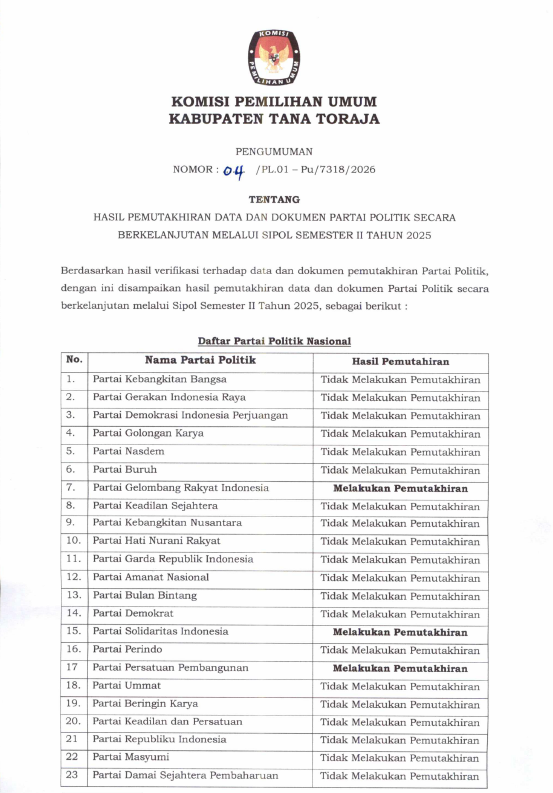 Berdasarkan hasil Verifikasi terhadap Data dan Dokumen Pemutakhiran Partai Politik, dengan ini KPU Kabupaten Tana Toraja menyampaikan Hasil Pemutakhiran Data dan Dokumen Partai Politik secara berkelanjutan melalui SIPOL Semester II Tahun 2025 melalui Pengumuman Nomor : 04/PL.01-Pu/7318/2026 per Tanggal 05 Januari 2026.