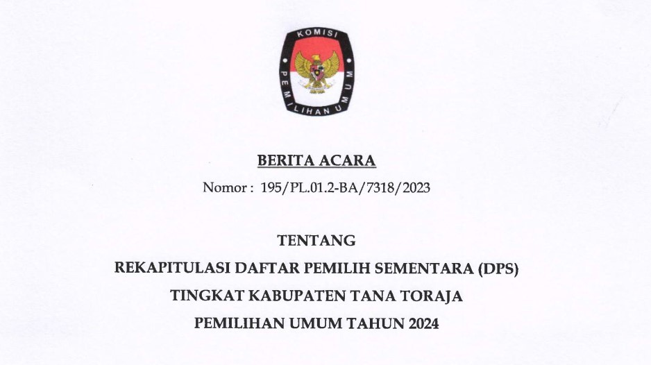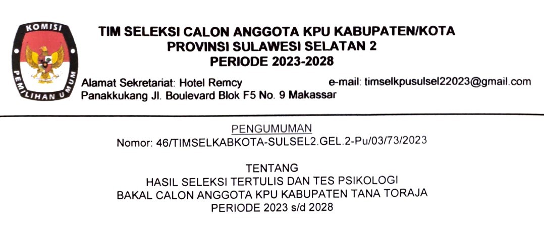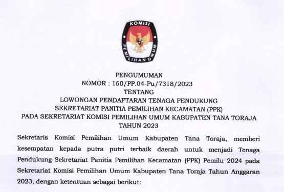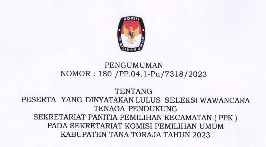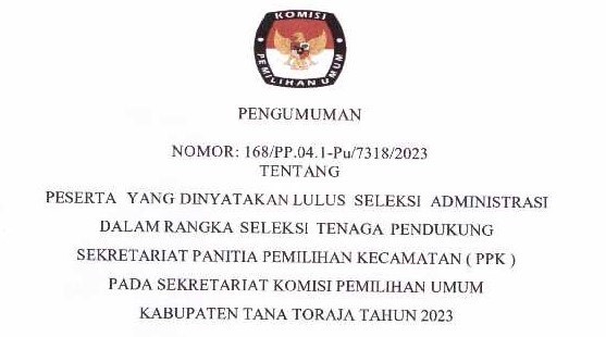 KPU Tana Toraja - Berdasarkan hasil seleksi berkas pendaftaran yang masuk dalam rangka Seleksi Tenaga Pendukung Sekretariat Panitia Pemilihan Kecamatan (PPK) Pada Sekretariat Komisi Pemilihan Umum Kabupaten Tana Toraja dalam Pemilihan Umum Tahun 2024, diumumkan bahwa peserta sesuai lampiran dinyatakan Lulus Seleksi Administrasi dan selanjutnya dapat mengikut tes Seleksi Wawancara, dengan membawa bukti pendaftaran dan Kartu Tanda Penduduk (KTP) asli, Jadwal dan Tempat Terlampir.