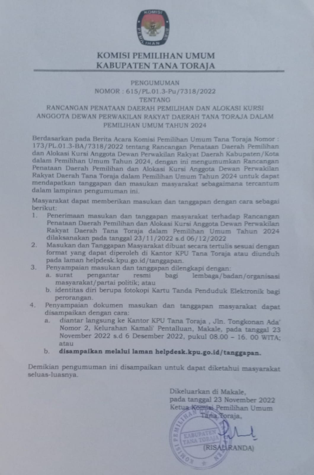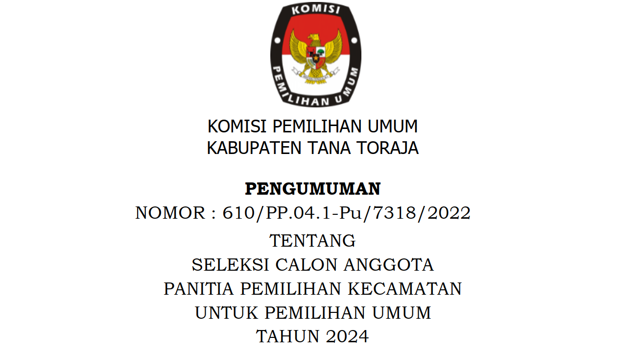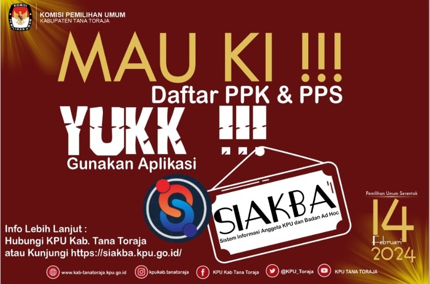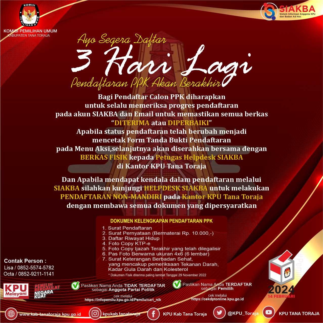#HaiTemanPemilih Ayo Segera Dafta 3 Hari lagi Pendaftaran PPK Akan Berakhir Bagi Pendaftar Calon PPK diharapkan untuk selalu memeriksa progres pendaftaran pada akun SIAKBA dan Email untuk memastikan semua berkas "DITERIMA atau DIPERBAIKI" Apabila status pendaftaran telah berubah menjadi mencetak Form Tanda Bukti Pendaftaran pada Menu Aksi,selanjutnya akan diserahkan bersama dengan BERKAS FISIK kepada Petugas Helpdesk SIAKBA di Kantor KPU Tana Toraja Dan Apabila mendapat kendala dalam pendaftaran melalui SIAKBA silahkan kunjungi HELPDESK SIAKBA untuk melakukan PENDAFTARAN NON-MANDIRI pada Kantor KPU Tana Toraja dengan membawa semua dokumen yang dipersyaratkan DOKUMEN KELENGKAPAN PENDAFTARAN PPK: 1. Surat Pendaftaran 2. Surat Pernyataan (Bermaterai Rp. 10.000,-) 3. Daftar Riwayat Hidup 4. Foto Copy KTP-e 5. Foto Copy Ijazah Terakhir yang telah dilegalisir 6. Pas Foto Berwarna ukuran 4x6 (6 lembar) 7. Surat Keterangan Berbadan Sehat, yang mencakup pemeriksaan Tekanan Darah, Kadar Gula Darah dan Kolesterol * Dokumen Fisik diterima paling lambat Tanggal 29 November 2022 Pastikan Nama And TIDAK TERDAFTAR sebagai Anggota Partai Politik cek melalui https://infopemilu.kpu.go.id/Pemilu/cari_nik