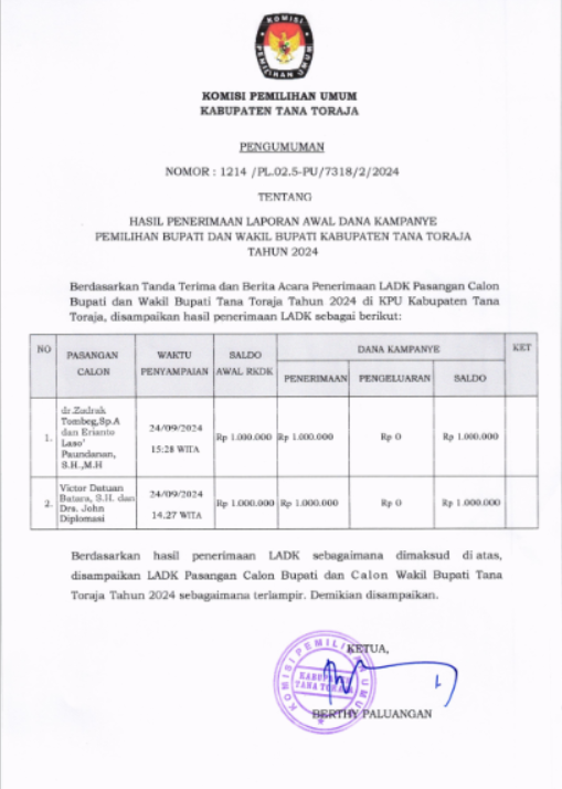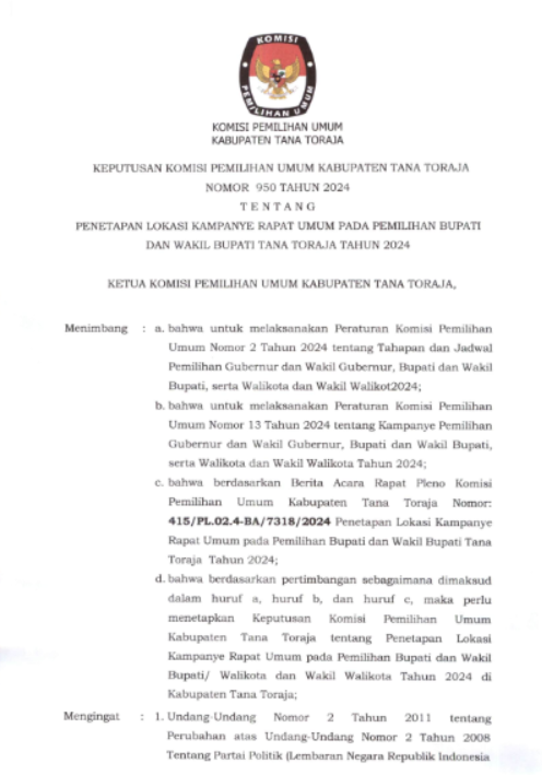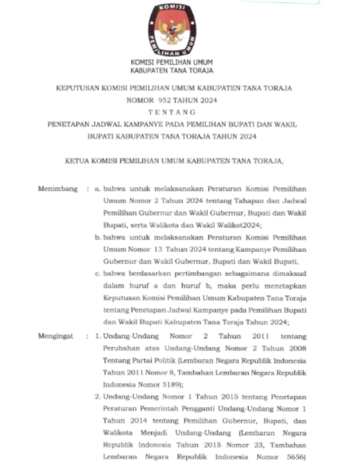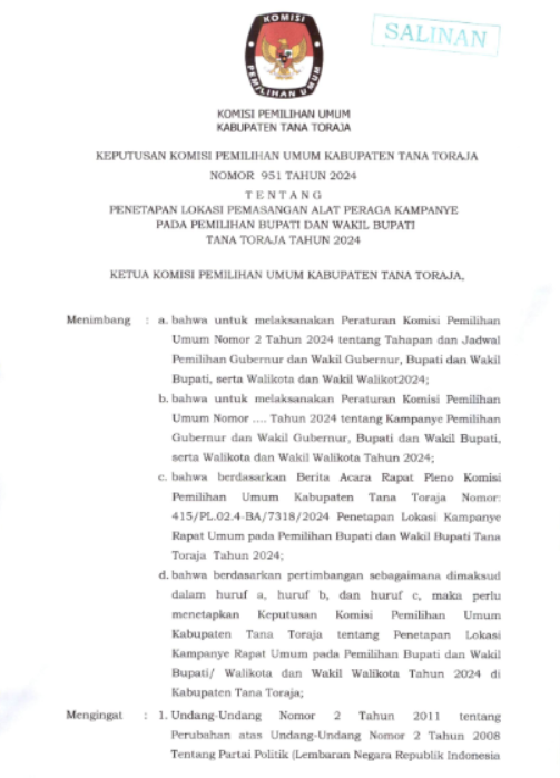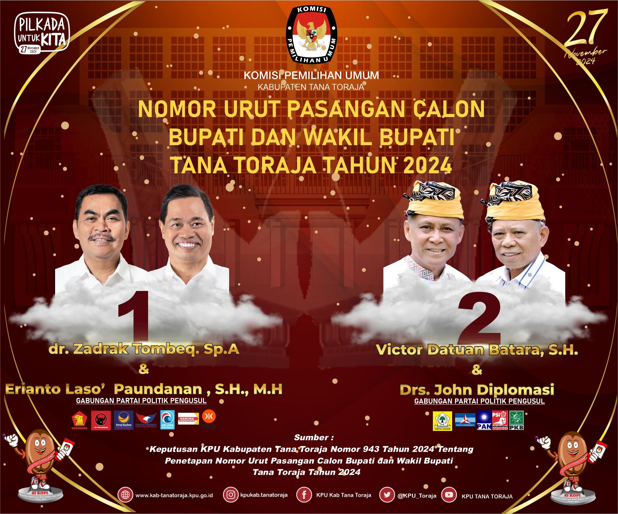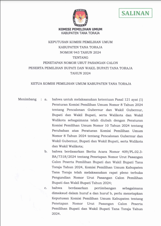 Keputusan Komisi Pemilihan Umum Kabupaten Tana Toraja Nomor 943 Tahun 2024 Tentang Penetapan Nomor Urut Pasangan Calon Peserta Pemilihan Bupati dan Wakil Bupati Tana Toraja Tahun 2024.