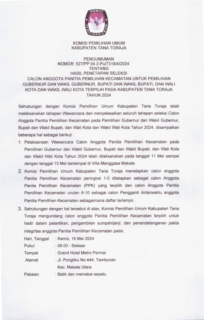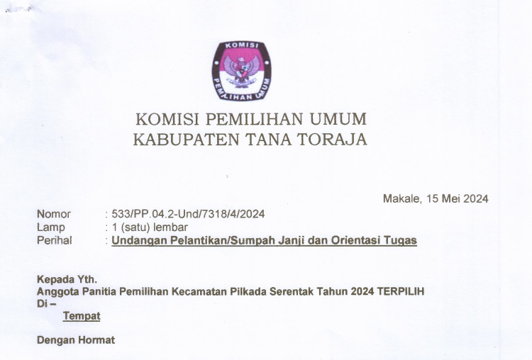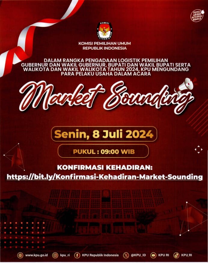 Sehubungan dangan akan dilaksanakannya kegiatan Market Sounding dalam rangka pengadaan Logistik Pemilihan 2024 pada Rapat Koordinasi dan Bimbingan Teknis Persiapan Pengadaan Logistik Pemilihan Gubernur dan Wakil Gubernur, Bupati dan Wakil Bupati, serta Walikota dan Wakil Walikota Tahun 2024.