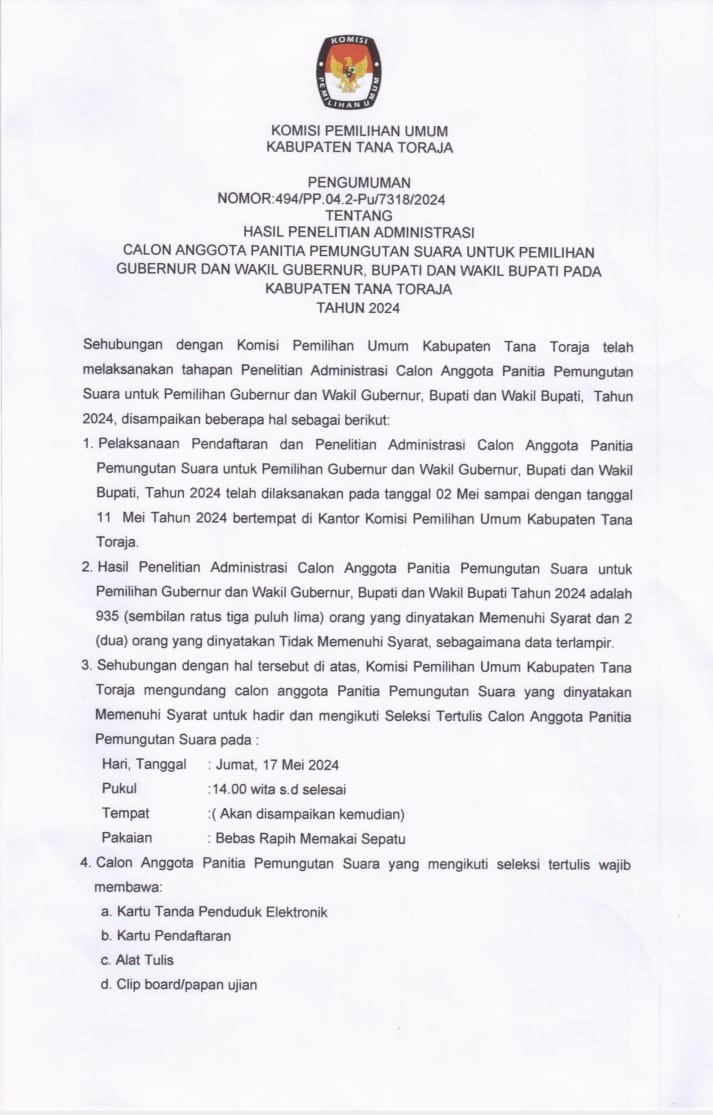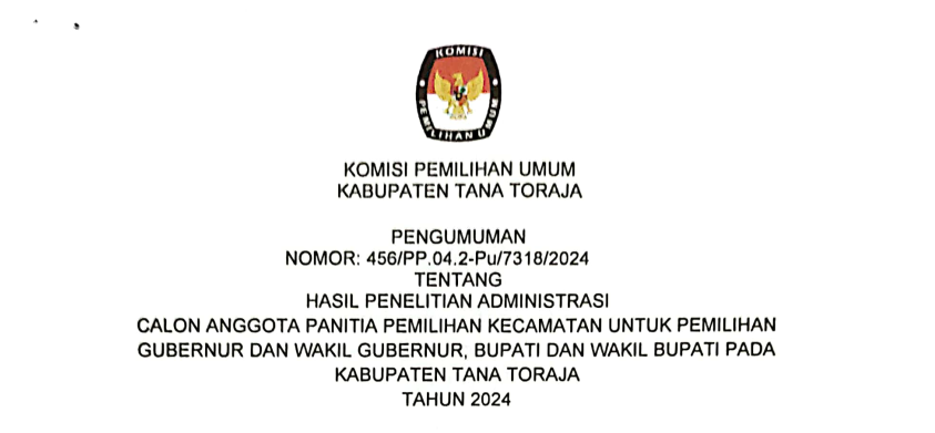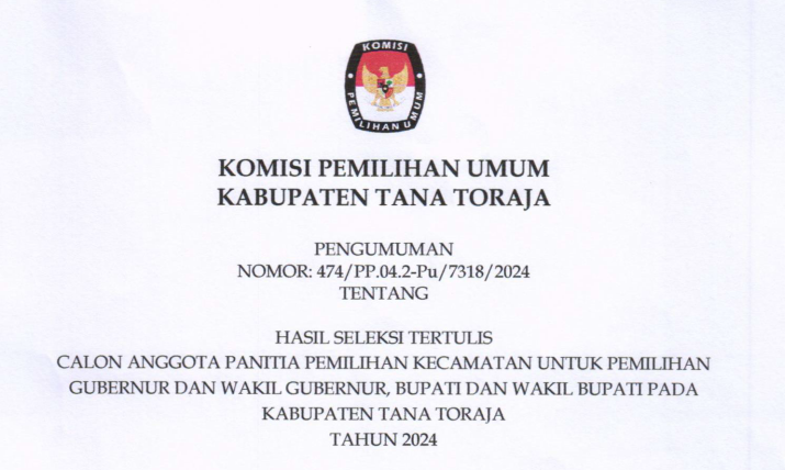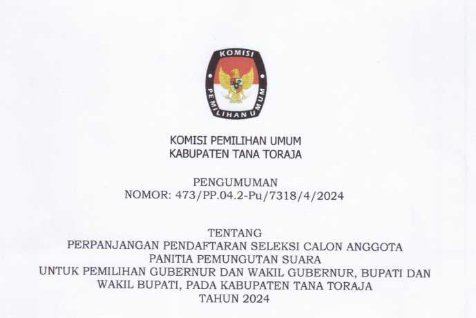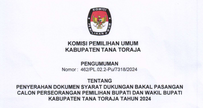 ##TemanPemilih, Sehubungan dengan Penyelenggaraan tahapan Peraturan KPU Nomor 2 Tahun 2024 tentang Tahapan dan Jadwal Pemilihan Gubernur dan Wakil Gubemur, Bupati dan Wakil Bupati, serta Walikota dan Wakil Walikota Tahun 2024, ketentuan Pasal 41 Undang-Undang Nomor 10 Tahun 2016 tentang Perubahan Kedua atas Undang-Undang Nomor 1 Tahun 2015 tentang Penetapan Peraturan Pemerintah Pengganti Undang-Undang Nomor 1 Tahun 2024 tentang Pemilihan Gubernur, Bupati dan Walikota Menjadi Undang-Undang, bakal pasangan calon perseorangan Kepala Daerah dapat mendaftar jika memenuhi syarat dukungan jumlah penduduk, maka Komisi Pemilihan Umum Kabupaten (KPU) Tana Toraja mengumumkan Penyerahan Syarat Dukungan Bakal Pasangan Calon Perseorangan Pemilihan Bupati dan Wakil Bupati Kabupaten Tana Toraja Tahun 2024.