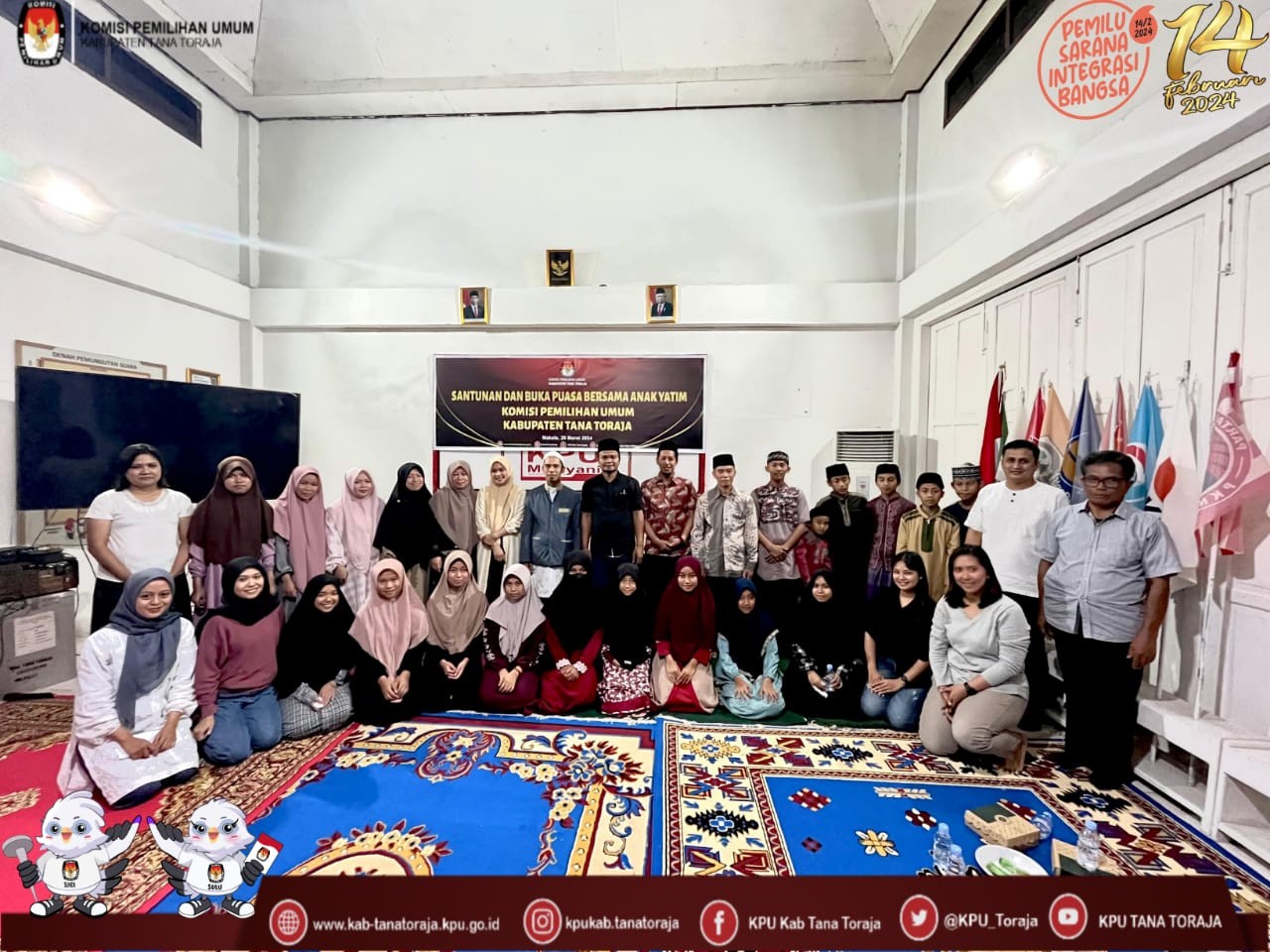 #TemanPemilih, Dalam rangka Kepedulian KPU terhadap sesama, Khususnya anak yatim yang membutuhkan kasih sayang dan kebersamaan melalui silaturahmi serta menindaklanjuti Surat Dinas Sekretaris Jenral KPU RI Nomor 1312/SDM.07.4-SD/03/2024 Perihal Santunan dan Buka Puasa Bersama Anak Yatim di Lingkungan KPU tanggla 25 Maret 2024, maka KPU Kabupaten Tana Toraja melaksanakan Santunan dan Buka Puasa Bersama Anak Yatim di Aula Kantor KPU Kabupaten Tana Toraja pada hari jumat 29 Maret 2024.