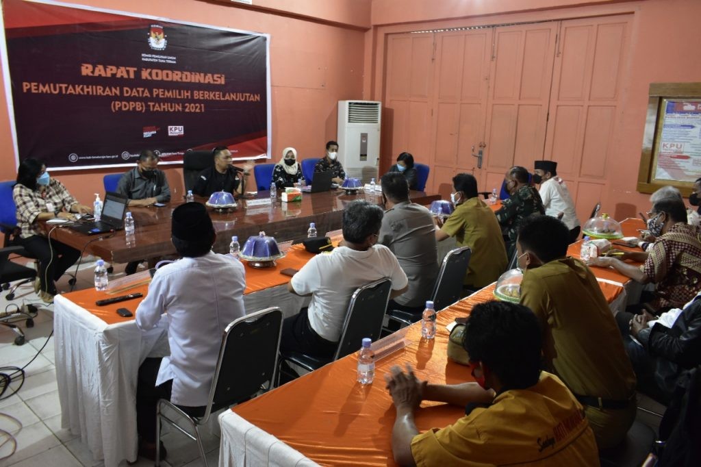 Selasa (28/9/2021),KPU Kabupaten Tana Toraja mengadakan Rapat Koordinasi Pemutakhiran Data Pemilih Berkelanjutan (PDPB) periode sebtember 2021 dengan mengundang para pemangku kepentingan (Stakeholder terkait). Rakor PDPB yang di buka oleh Ketua KPU Kab. Tana Toraja ini,dipimpin oleh anggota KPU Divisi Perencanaan data dan informasi didampingi seluruh jajaran komisieoner dan sekretariat KPU Tana Toraja. Para pemangku kepentingan yang turut hadir dalam rakor tersebut yakni Bawaslu Tana Toraja, Dandim 1414 Tana Toraja, Polres Tana Toraja, Kabag pemerintahan, DPML, Cabang dinas pendidikan wilayah X, Kepala Kementrian Agama dan Partai Politik sekabupaten Tana Toraja. Peserta rakor memberi masukan terkait data pemilih yang sudah meninggal dunia, pindah domisili,alih status,dan pemilih baru.Dari hasil rakor ini selanjutnya akan di tetapkan oleh KPU Kabupaten Tana Toraja pada tanggal 30 September mendatang. Perencanaan Data Dan Informasi KPU Kabupaten Tana Toraja menambahkan bahwa PDPB ini adalah DPT dan DPTb PILKADA 2020 yang dimutakhirkan setiap bulannya, namun di tahun 2021 ini PDPB tidak lagi berbentuk Rapat Pleno Terbuka, melainkan dalam bentuk Rapat Koordinasi,selain itu intan juga mengajak peserta rakor yang hadir agar membantu KPU Tana Toraja untuk turut serta mensukseskan PDPB ini dengan cara memberikan informasi manakala ada masyarakat yang sudah TMS,alih status dan sudah memenuhi syarat tapi belum terdaftar,dia menambahkan bahwa untuk formulir tanggapan masyarakat dapat di unduh di website KPU Tana Toraja https://kab-tanatoraja.kpu.go.id atau bisa langsung ke kantor KPU Tana Toraja untuk memberi tanggapan. Nantinya PDPB ini akan diumumkan di Website KPU Tana Toraja agar bisa dilihat dan diakses oleh masyarakat, parpol, Bawaslu maupun Disdukcapil, termasuk lampiran hasil update yang dilakukan KPU saat rakor tersebut.