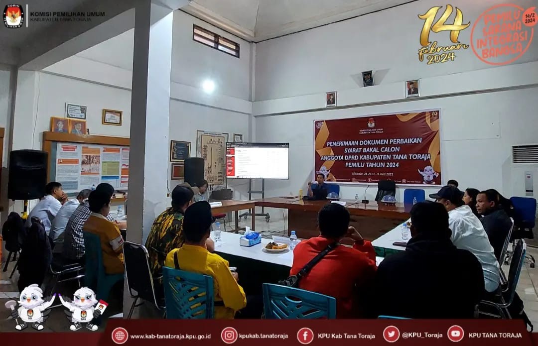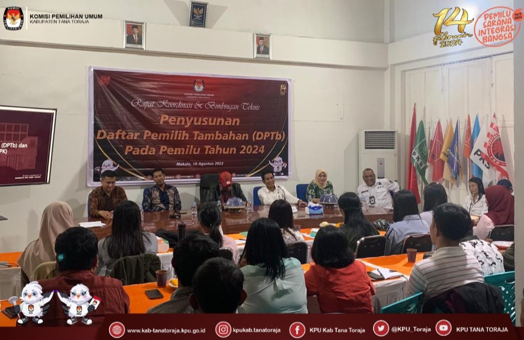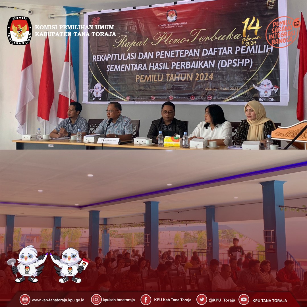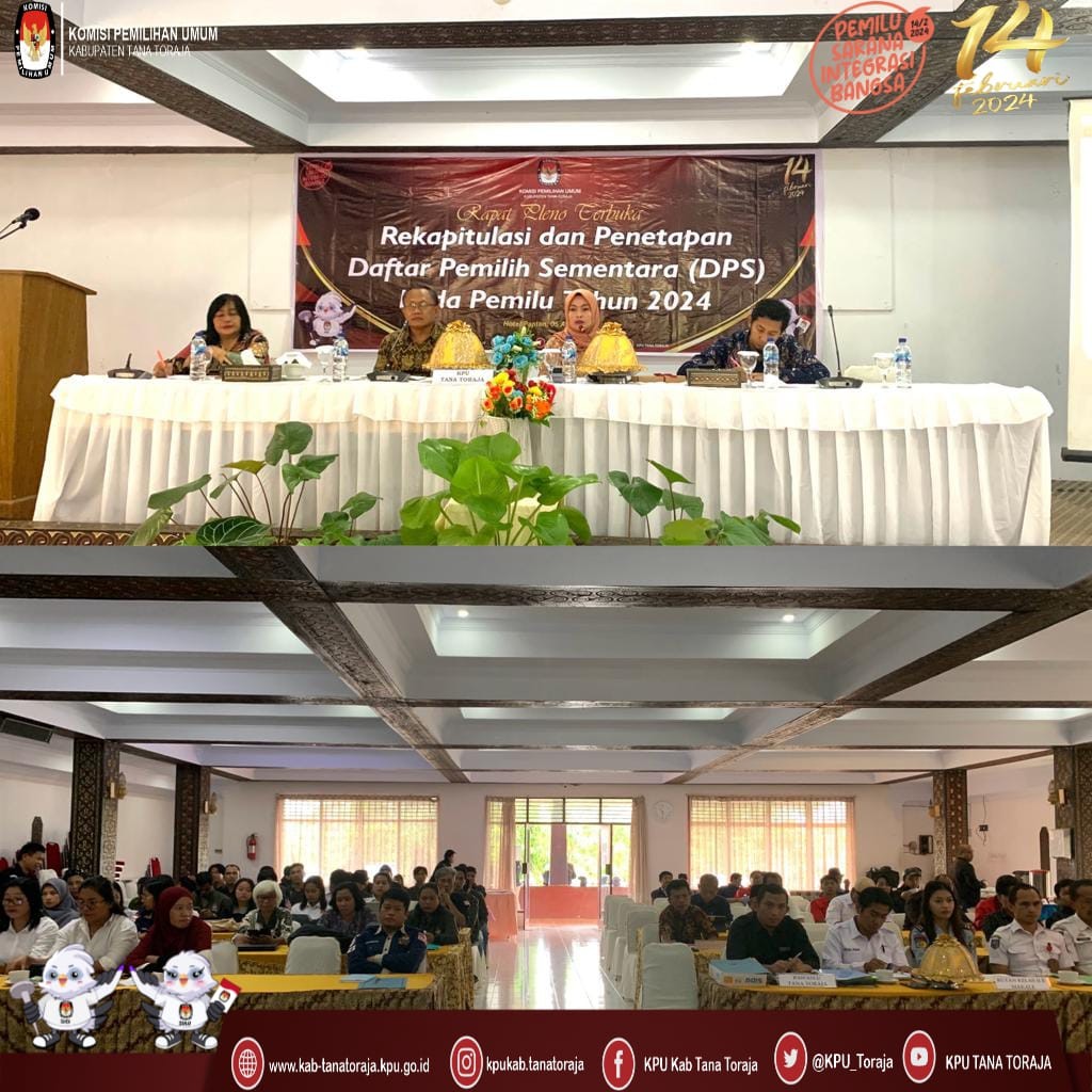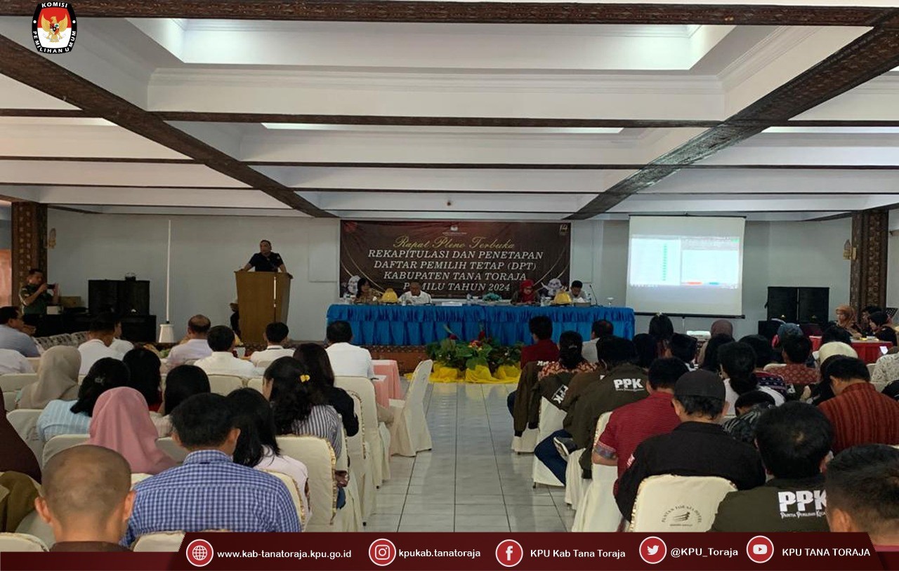 KPU Tana Toraja - Berdasarkan Peraturan Komisi Pemilihan Umum Nomor 7 Tahun 2023 tentang perubahan atas Peraturan Komisi Pemilihan Umum Nomor 7 Tahun 2022 tentang Penyusunan Daftar Pemilih Dalam Penyelenggaraan Pemilihan Umum dan Sistem Informasi Data Pemilih, serta Surat Keputusan Komisi Pemilihan Umum Nomor 27 Tahun 2023 tentang Pedoman Teknis Penyusunan Daftar Pemilih Dalam Negeri pada Penyelenggaraan Pemilihan Umum, maka dengan itu Komisi Pemilihan Umum Kabupaten Tana Toraja melaksanakan Rapat Pleno Terbuka Rekapitulasi dan Penetapan Daftar Pemilih Tetap (DPT) Tingkat Kabupaten pada Pemilihan Umum Tahun 2024.